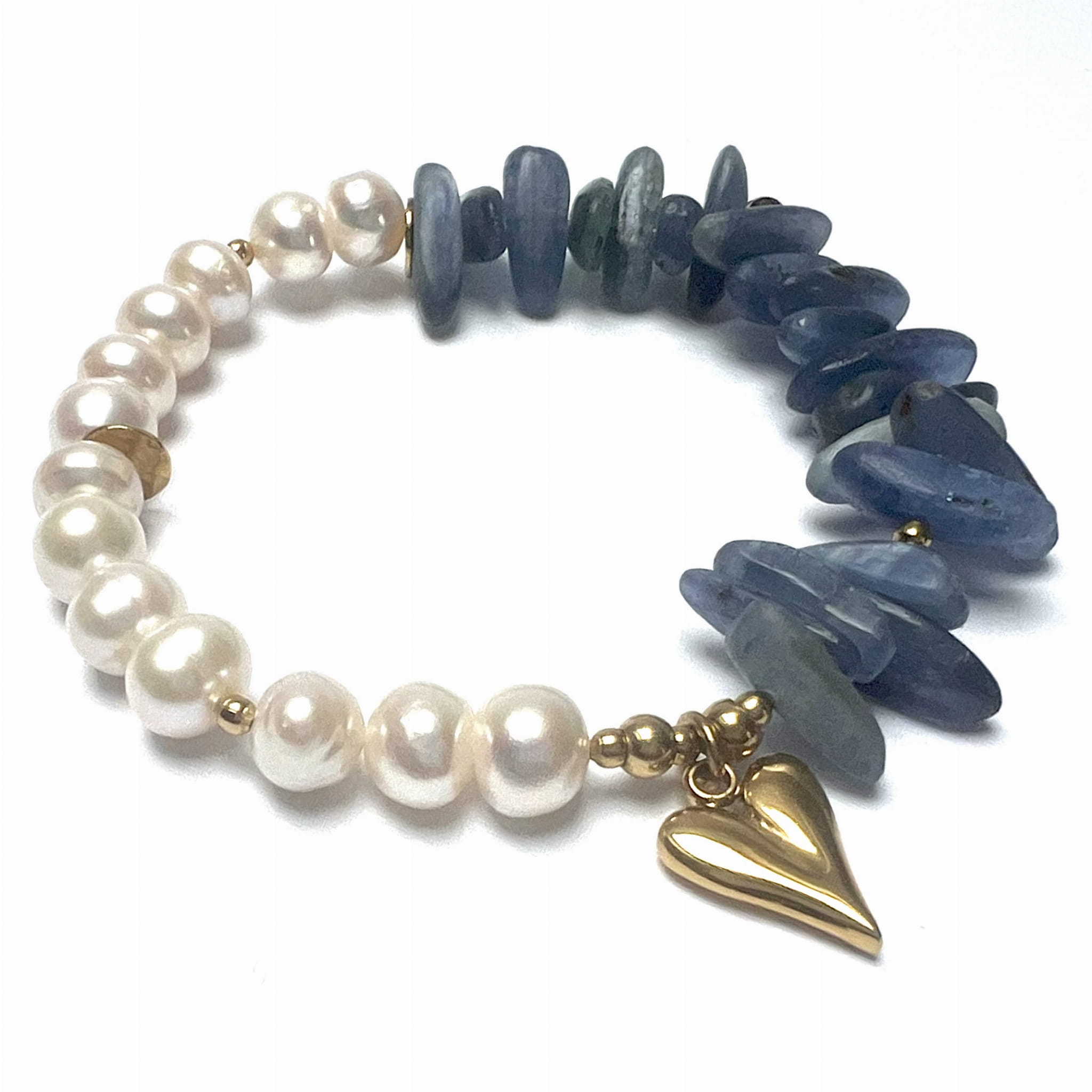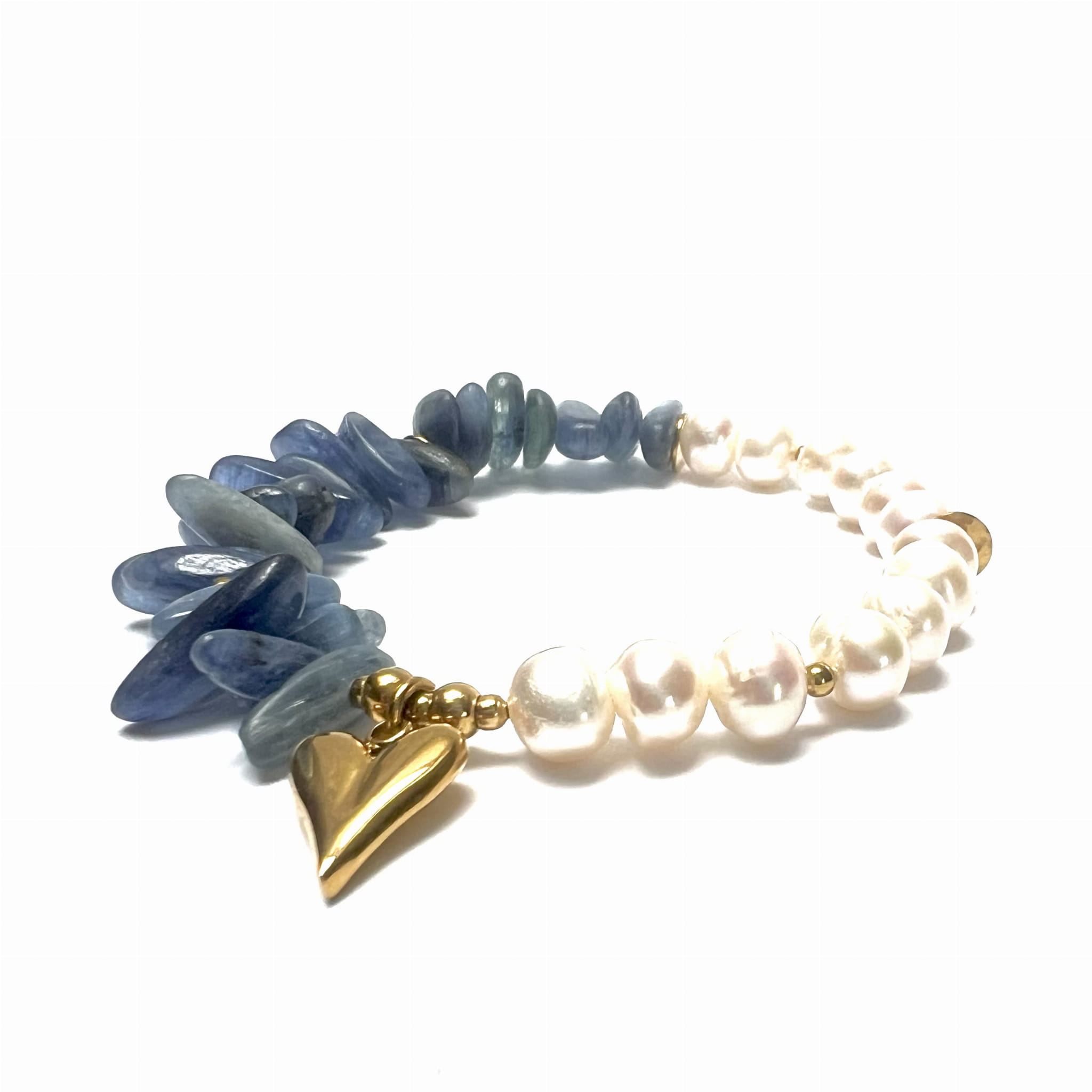 Bransoletka wykonana na elastycznej żyłce, z pereł wielkości ok 8mm i nieregularnego kyanitu, ozdobiona serduszkiem ze stali szlachetnej w kolorze złota.